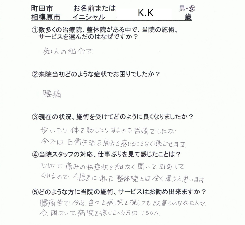 <町田、相模原で慢性的な腰痛、膝痛、足のシビレなら、町田街道沿いのからだ回復整体町田へ>