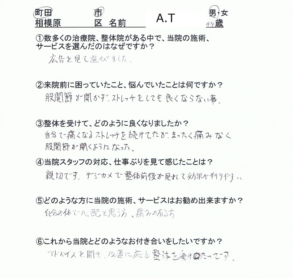 アドバイスを聞き、必要に応じ整体を受けたいです。