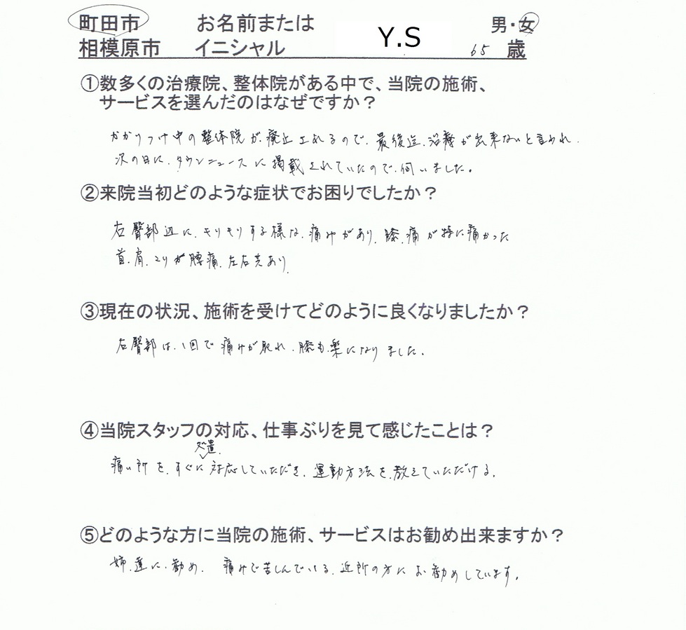 ひざの強い痛みから解放されたばかりか、左右向けなかった首の状態も良くなり車の運転の安心度も上がって本当に良かったです。